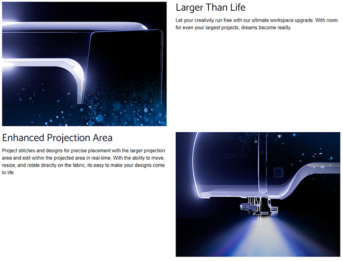 See your embroidery designs, stitches, buttonholes and even sewing guidelines spread out before you with the 200 x 127mm projector area – an increase of 2.6x from the Luminaire XP3.